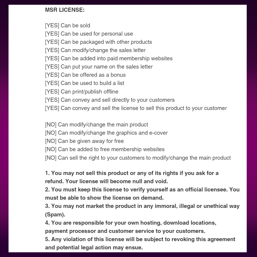 1. You may not sell this product or any of its rights if you ask for a refund. Your license will become null and void.