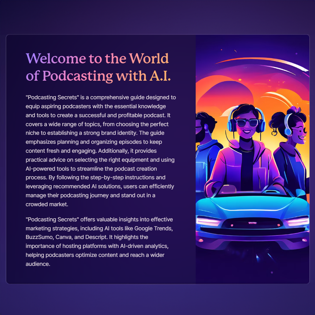 "Podcasting Secrets With A.I." is a comprehensive guide designed to equip aspiring podcasters with the essential knowledge and tools to create a successful and profitable podcast.